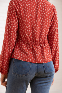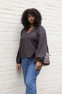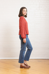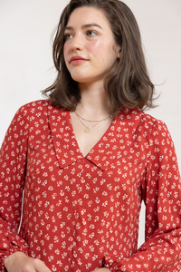 The Cosmo Blouse is a chic pullover top with just the right balance of ease and shaping. Designed with a flattering V-neckline and a soft flat lay collar, Cosmo is semi-fitted through the body with bust darts and gentle elastic at the back waist for a comfortable, tailored feel. Gathered sleeves with elastic hems add a touch of volume and detail, while the center front seam and double-fold hem keep the finish clean and polished. Easy to style tucked into trousers, paired with skirts, or worn loose with jeans, Cosmo is a versatile piece you’ll want to sew in multiples for year-round wear.