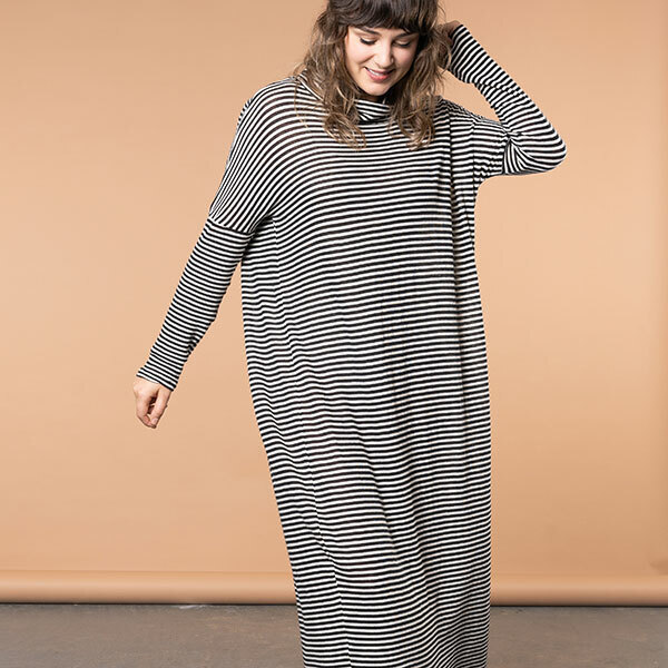 Cora is wearing a size 8 Devon dress graded to a 10 at the waist and hips, with 1” added to the sleeve length and 1/2” ease added to the bicep. Her measurements are 37”, 31 1/2”, 42 3/4” and she is 5’9”.