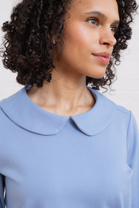 A soft flat lay collar adds a subtle vintage touch without feeling fussy, while the neckline is cleanly faced with a single-fold knit trim for a smooth, professional look. The fold-back placket creates crisp finish at the center front, complete with classic button closures for versatile styling.
